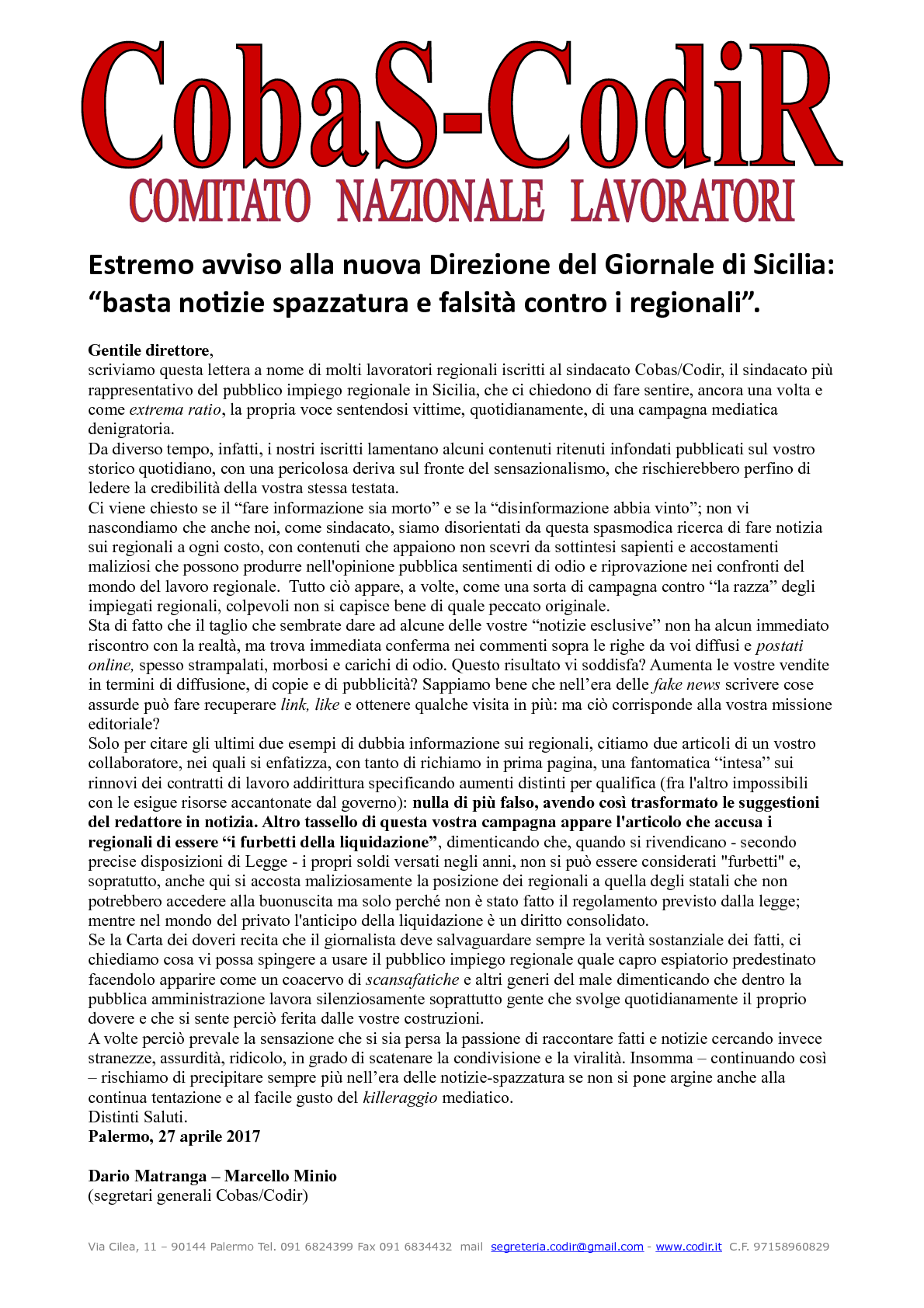 COBAS-CODIR Segreteria Generale -90144 Palermo, via Francesco Cilea n. 11 Tel. 091 6824399 – Fax 091 6834432 – email: segreteria.codir@gmail.com – Pec: segreteria.generale@pec.codir.it