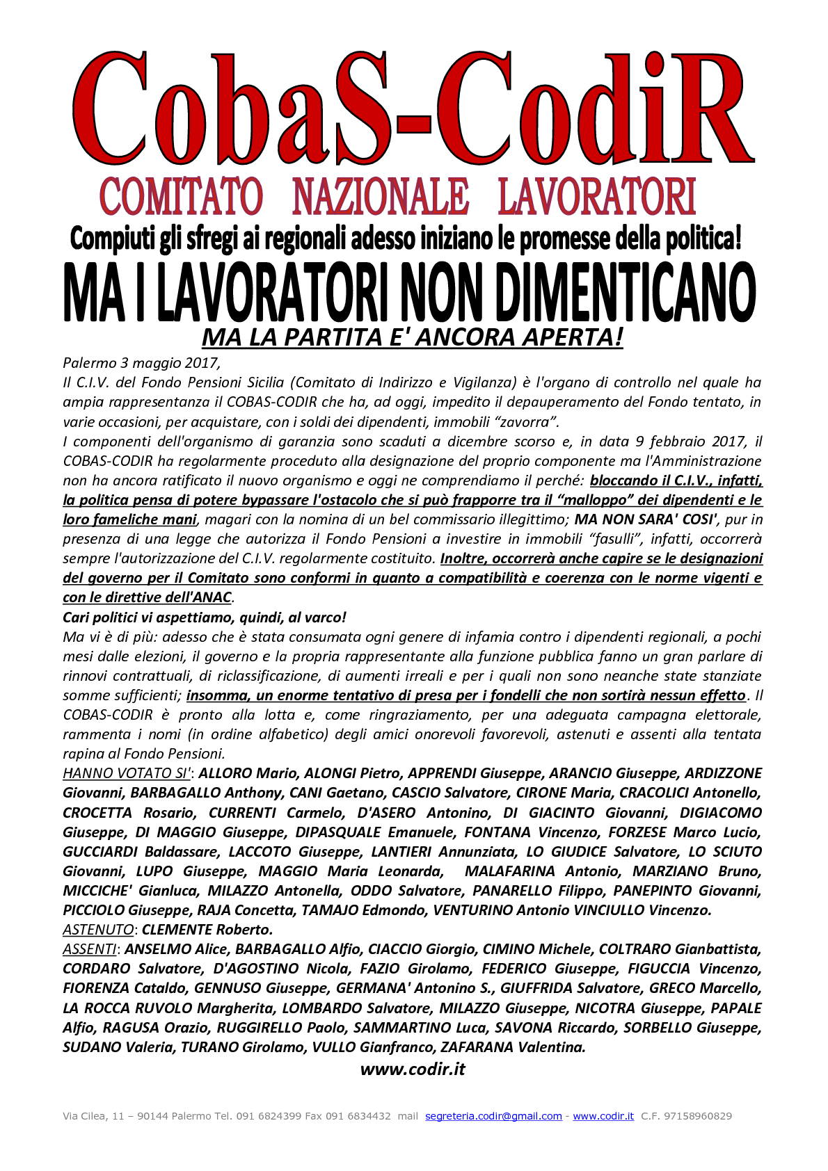 COBAS-CODIR Segreteria Generale -90144 Palermo, via Francesco Cilea n. 11 Tel. 091 6824399 – Fax 091 6834432 – email: segreteria.codir@gmail.com – Pec: segreteria.generale@pec.codir.it