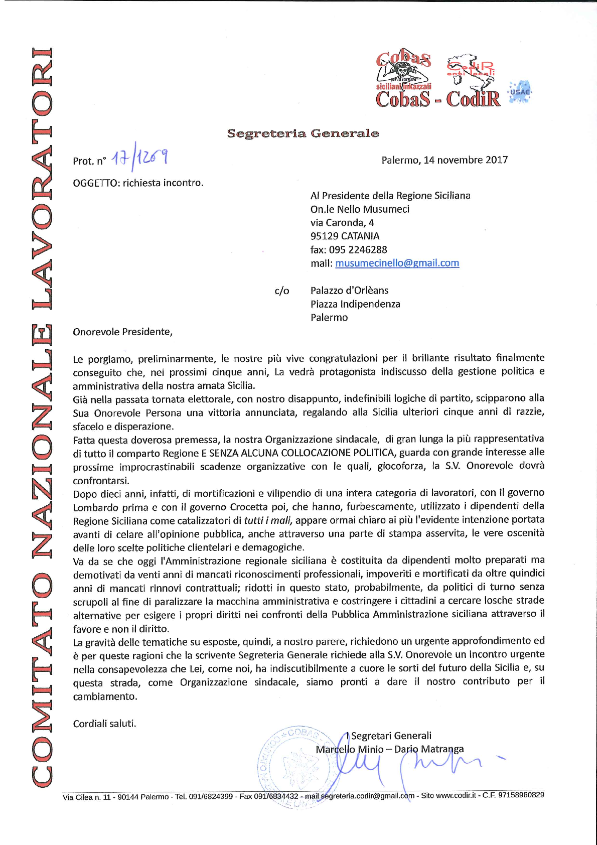 Questa è molto più di una lettera di richiesta di incontro e ha una sua precisa connotazione politica che non è la mia e ritengo non sia quella di molti di noi. Mi auguro. Non mi rappresenta affatto. Prendo atto della svolta che il sindacato indica voler effettuare al fianco di una cosi”onorevole persona” e mi dissocio profondamente dall’entusiastica esaltazione “per il brillante risultato finalmente conseguito”. Io esco dai Cobas e invito a farlo tutti i compagni che la pensano come me e che come me hanno provato un forte disagio, stupore e disgusto nel leggere la lettera qui riportata.