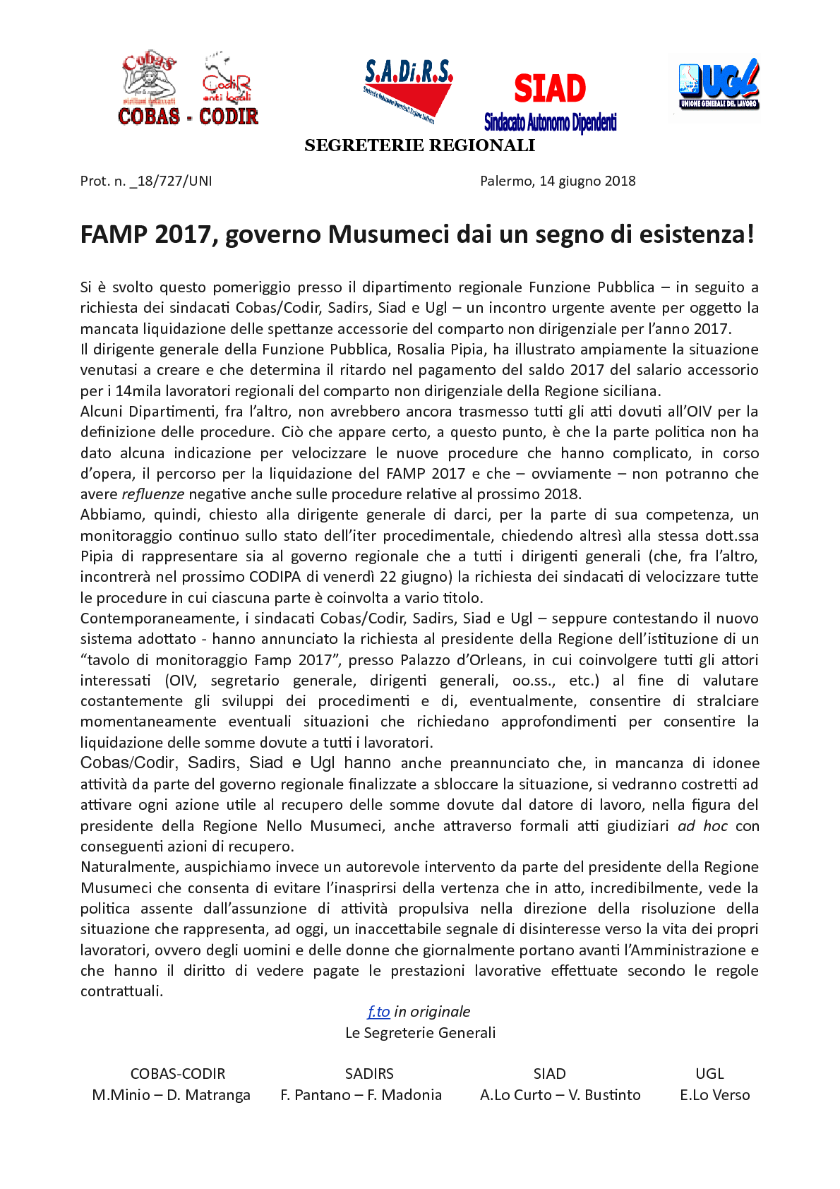 • Pagamento FAMP 2017, governo Musumeci dai un segno di esistenza!