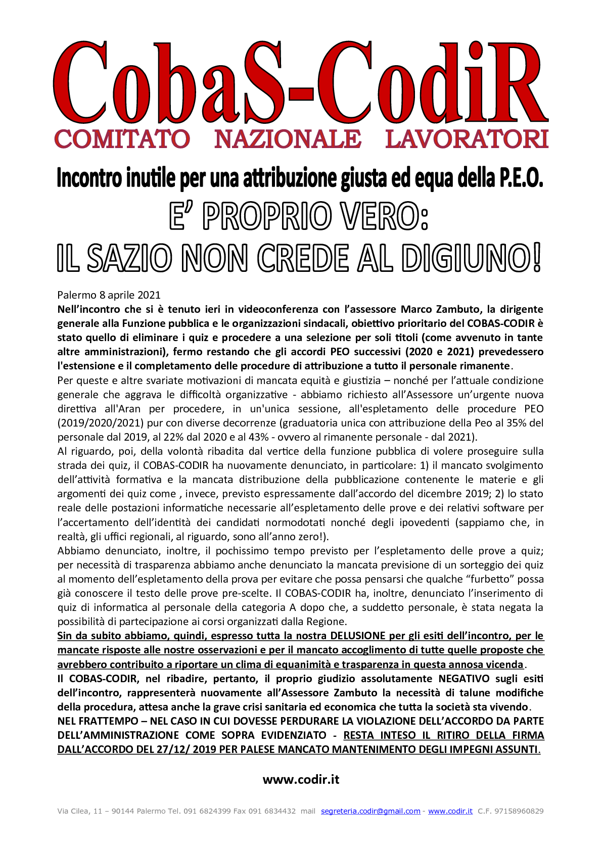 COBAS-CODIR Segreteria Generale -90144 Palermo, via Francesco Cilea n. 11 Tel. 091 6824399 – Fax 091 6834432 – email: segreteria.codir@gmail.com – Pec: segreteria.generale@pec.codir.it