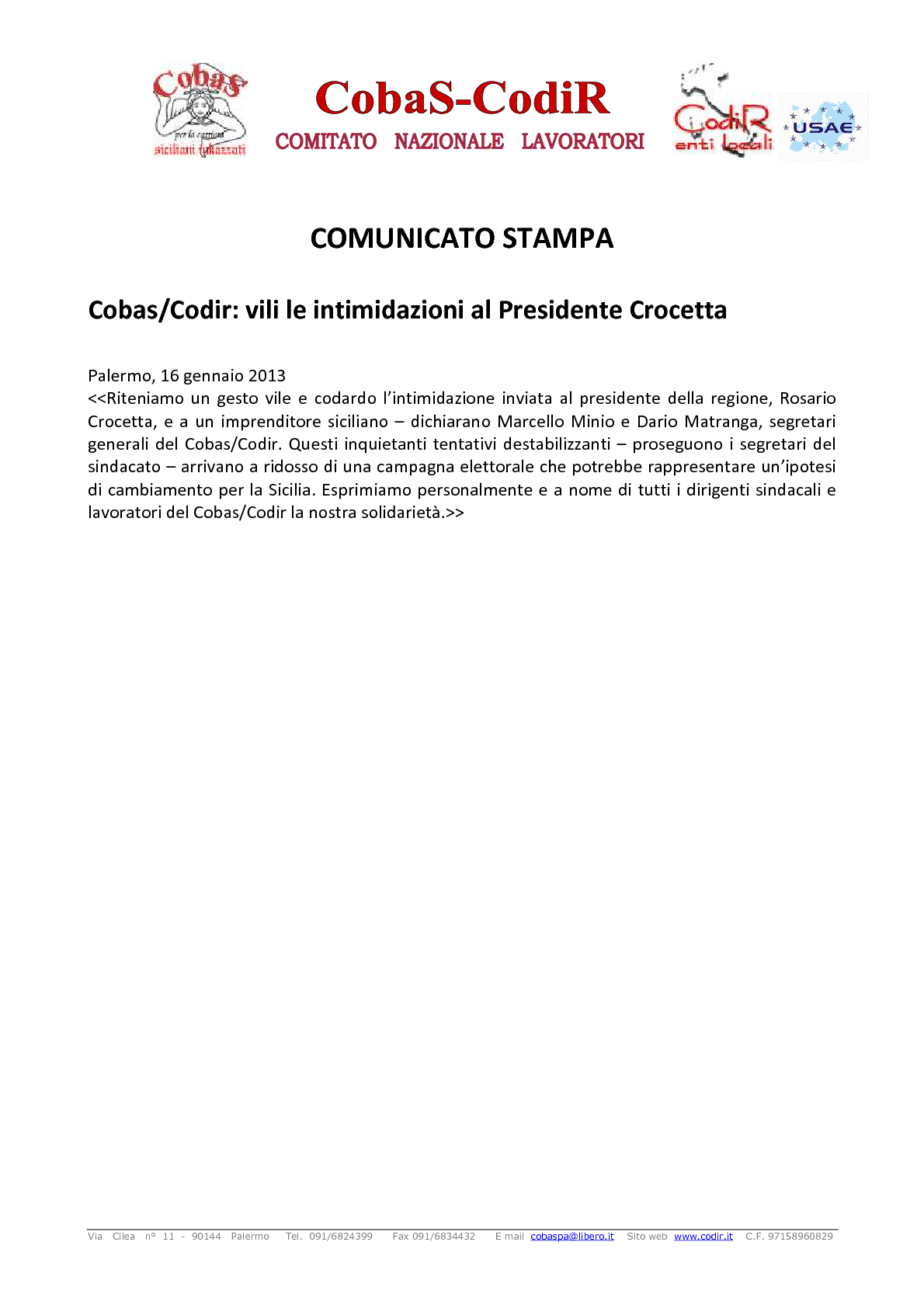 comunicato stampa 16 gennaio 2013