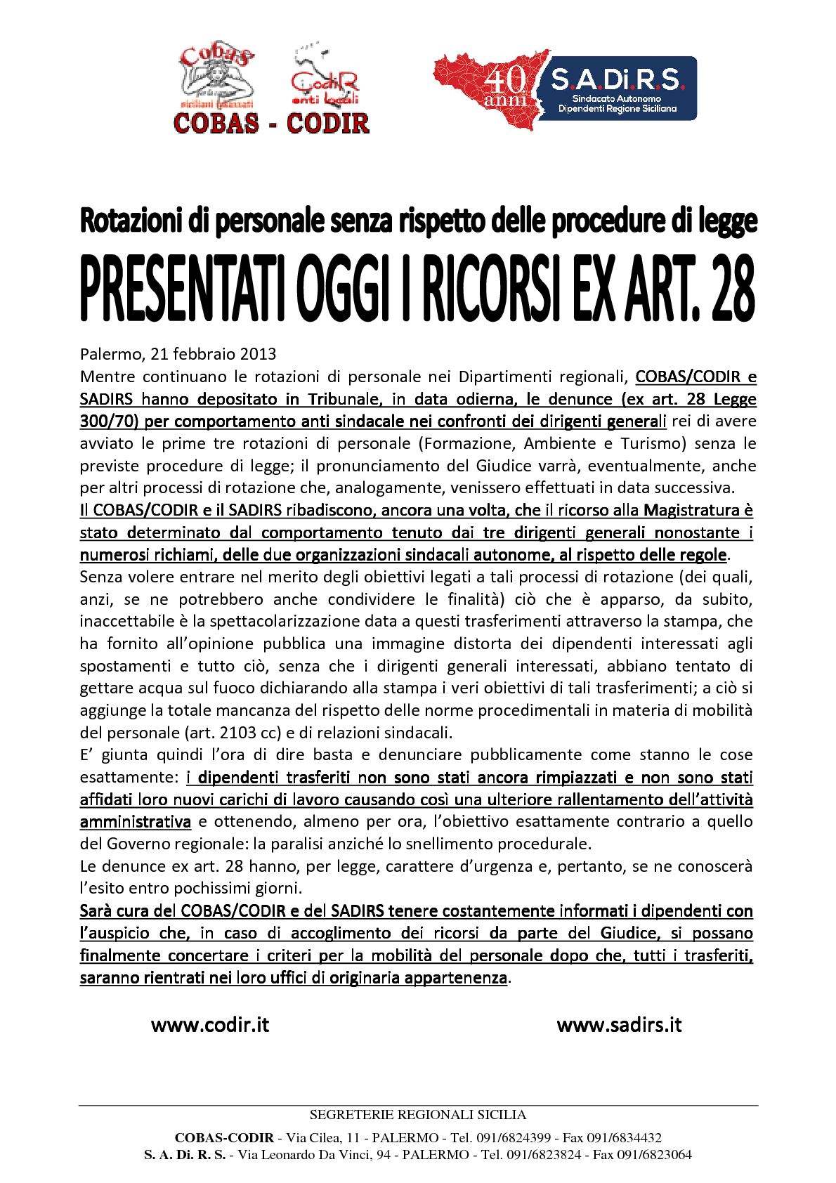 COBAS-CODIR Segreteria Generale -90144 Palermo, via Francesco Cilea n. 11 Tel. 091 6824399 – Fax 091 6834432 – email: segreteria.codir@gmail.com – Pec: segreteria.generale@pec.codir.it