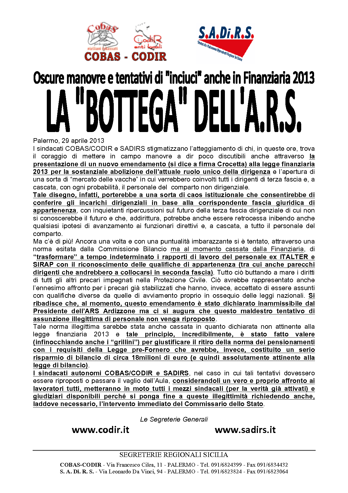 COBAS-CODIR Segreteria Generale -90144 Palermo, via Francesco Cilea n. 11 Tel. 091 6824399 – Fax 091 6834432 – email: segreteria.codir@gmail.com – Pec: segreteria.generale@pec.codir.it
