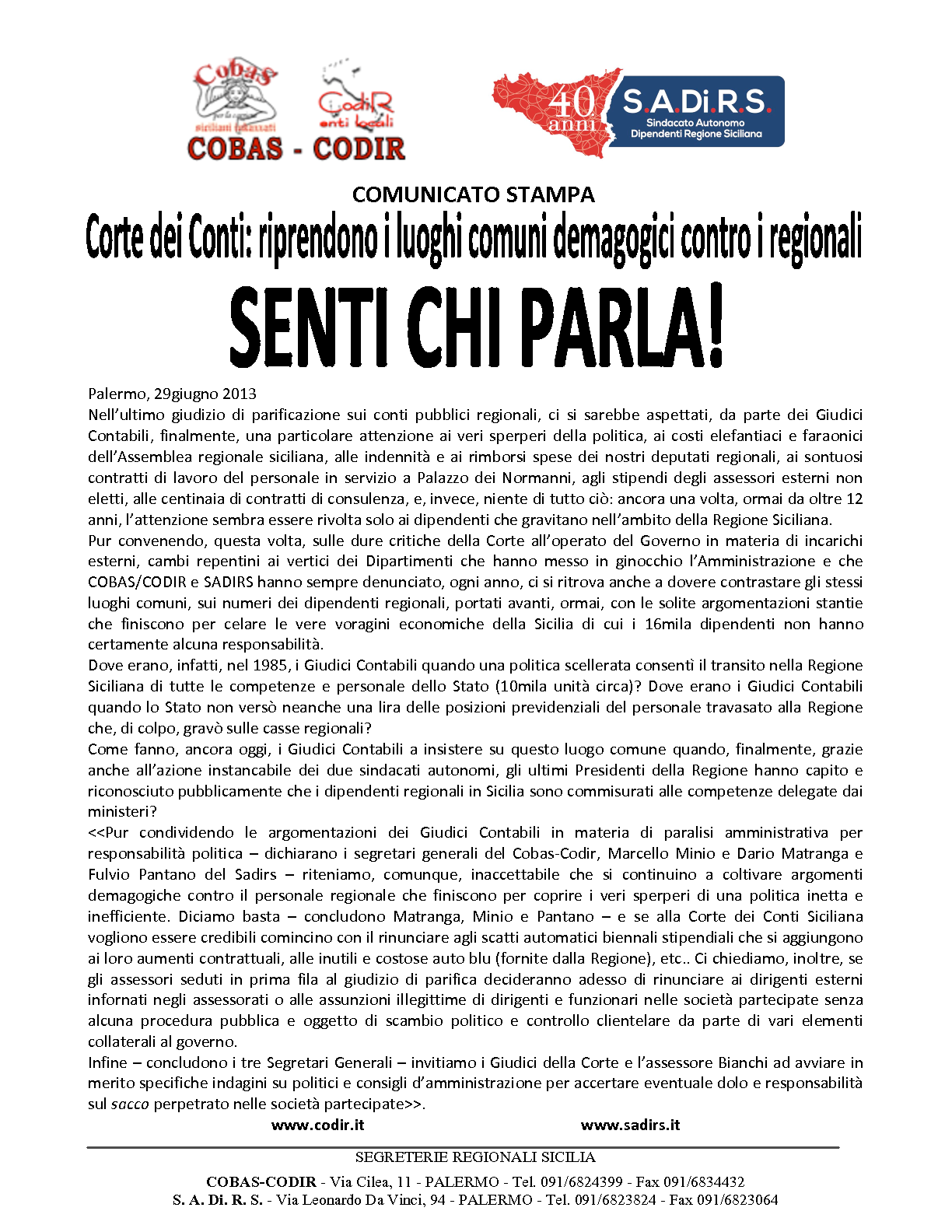 Dopo qualche giornalaio completamente disinformato o in malafede, si mettono anche i giudici contabili a diffondere dati confusionari sui dipendenti regionali!! Sono stanco di sentirmi definire un “privilegiato” con i miei 1000 euro al mese, per un lavoro malpagato di livello sicuramente superiore alla categoria di appartenenza (operaio). 1000 euro che mi faccio bastare per crescere due figli entrambe in età scolastica, e pagare la rata del mutuo……..di questo non si vuole parlare, invece fa sicuramente più notizia evidenziare gli ingiusti “privilegi” di cui godono una parte di dipendenti regionali con qualifiche dirigenziali. In momenti difficili come quello attuale, e guardando ai tanti giovani disoccupati, mi ritengo fortunato perchè almeno percepisco uno stipendio che mi consente di sopravvivere, ma i “privilegi” sono ben altra cosa !! Non capisco perchè certa stampa continua ad accomunarci tutti, senza distinzioni, fomentando l’odio della gente nei confronti di tutta la categoria dei regionali? Non capite che questo gioco potrebbe diventare pericoloso ??