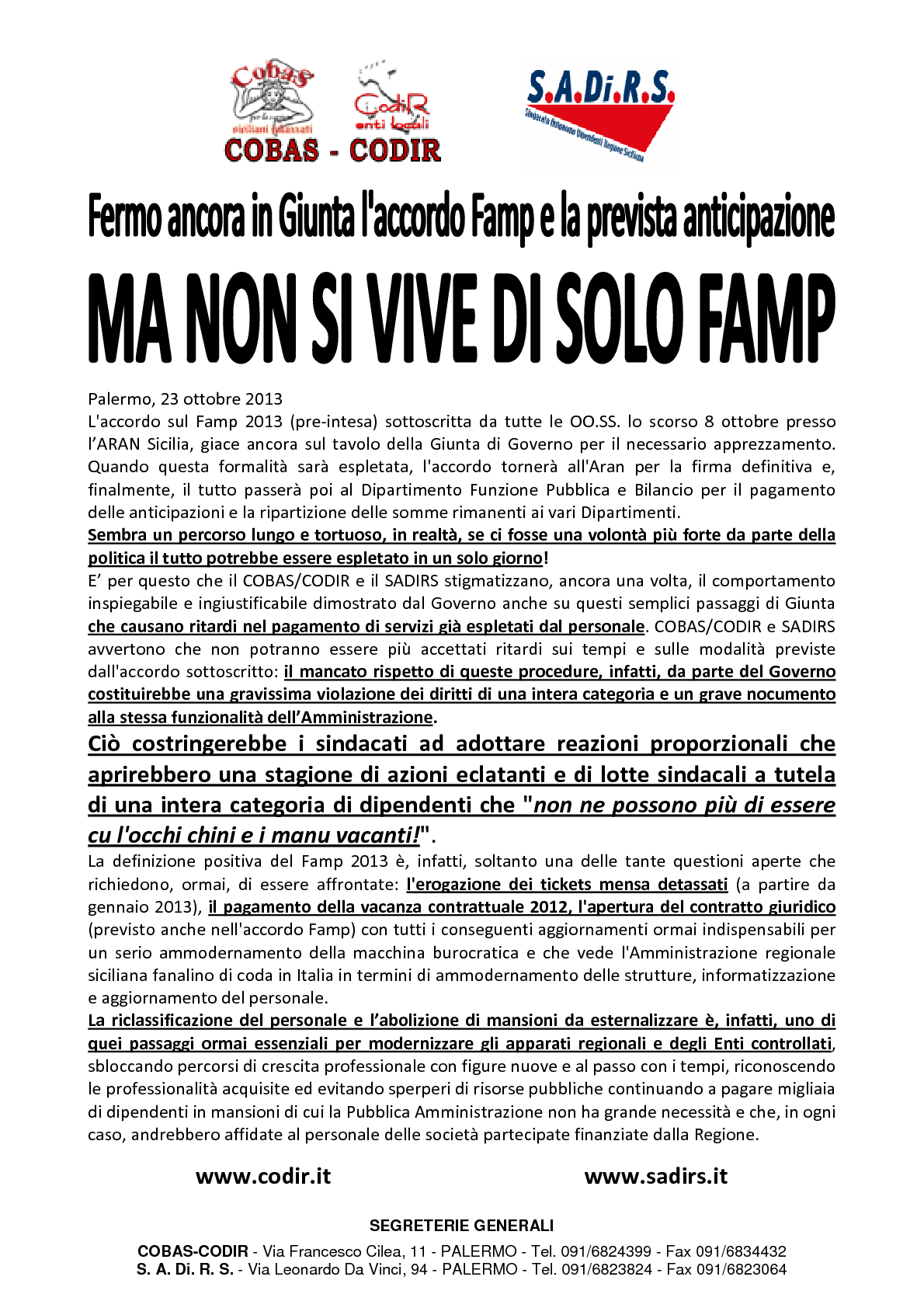 COBAS-CODIR Segreteria Generale -90144 Palermo, via Francesco Cilea n. 11 Tel. 091 6824399 – Fax 091 6834432 – email: segreteria.codir@gmail.comPec: segreteria.generale@pec.codir.it