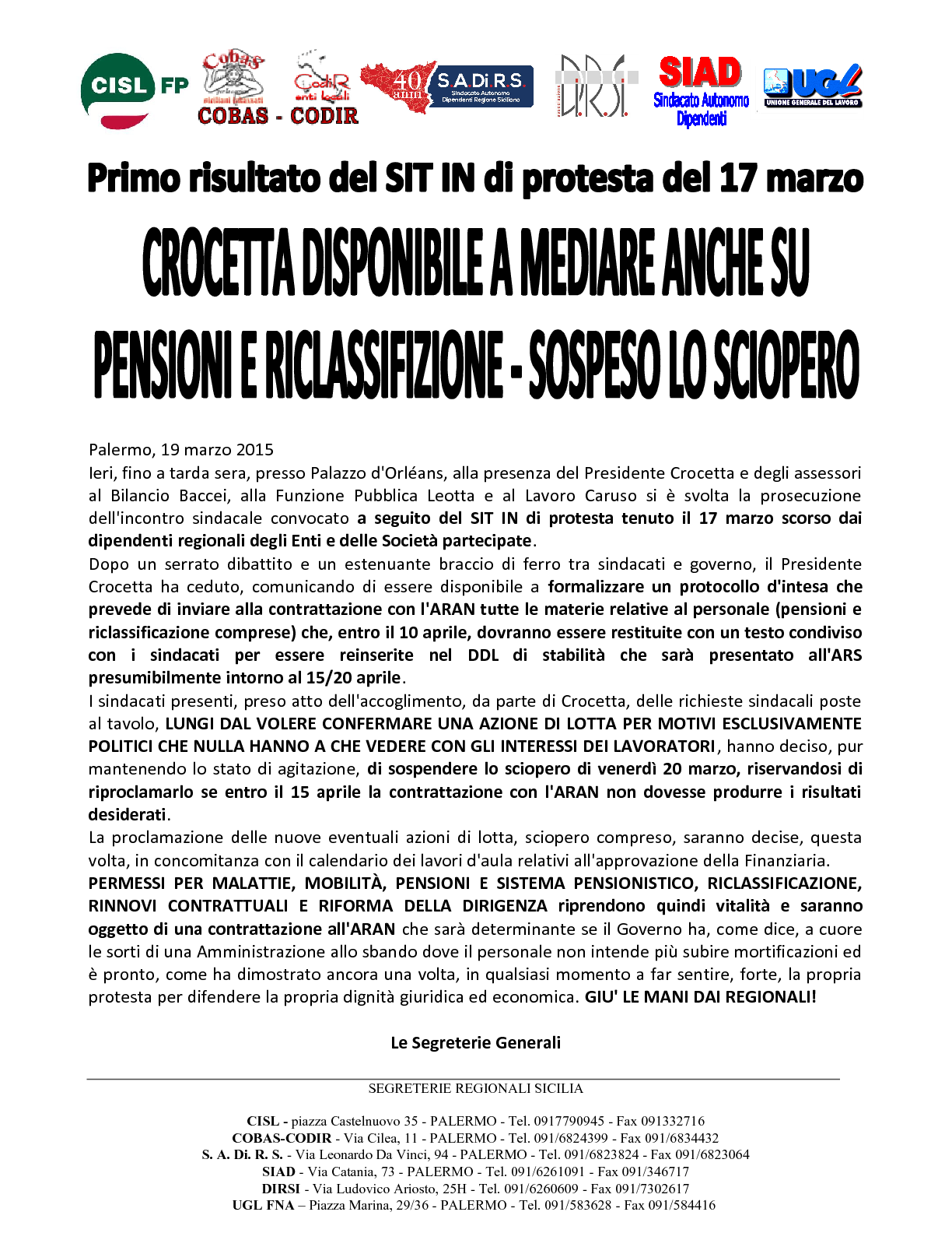 Il sindacato deve fare abbandonare a Crocetta questa folle idea di rapinare le pensioni dei propri dipendenti per «lanciare un segnale politico» , per fare facile populismo da utilizzare in trasmissioni TV o sulla stampa.