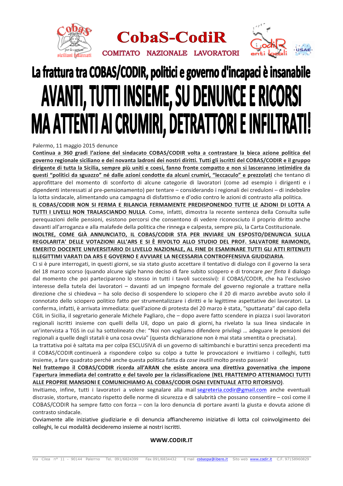 COBAS-CODIR Segreteria Generale -90144 Palermo, via Francesco Cilea n. 11 Tel. 091 6824399 – Fax 091 6834432 – email: segreteria.codir@gmail.comPec: segreteria.generale@pec.codir.it