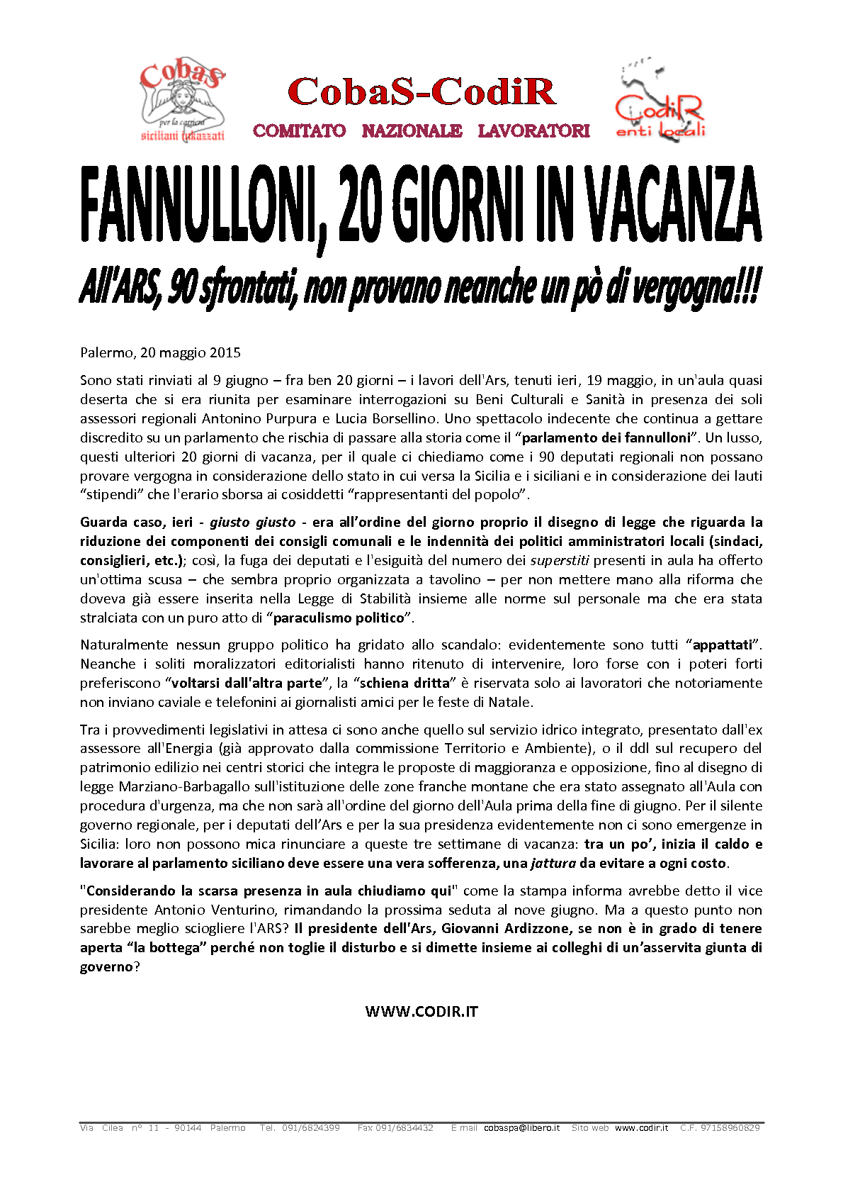COBAS-CODIR Segreteria Generale -90144 Palermo, via Francesco Cilea n. 11 Tel. 091 6824399 – Fax 091 6834432 – email: segreteria.codir@gmail.comPec: segreteria.generale@pec.codir.it