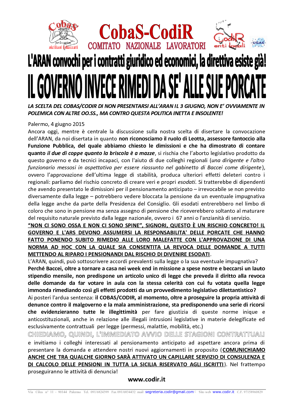 COBAS-CODIR Segreteria Generale -90144 Palermo, via Francesco Cilea n. 11 Tel. 091 6824399 – Fax 091 6834432 – email: segreteria.codir@gmail.comPec: segreteria.generale@pec.codir.it