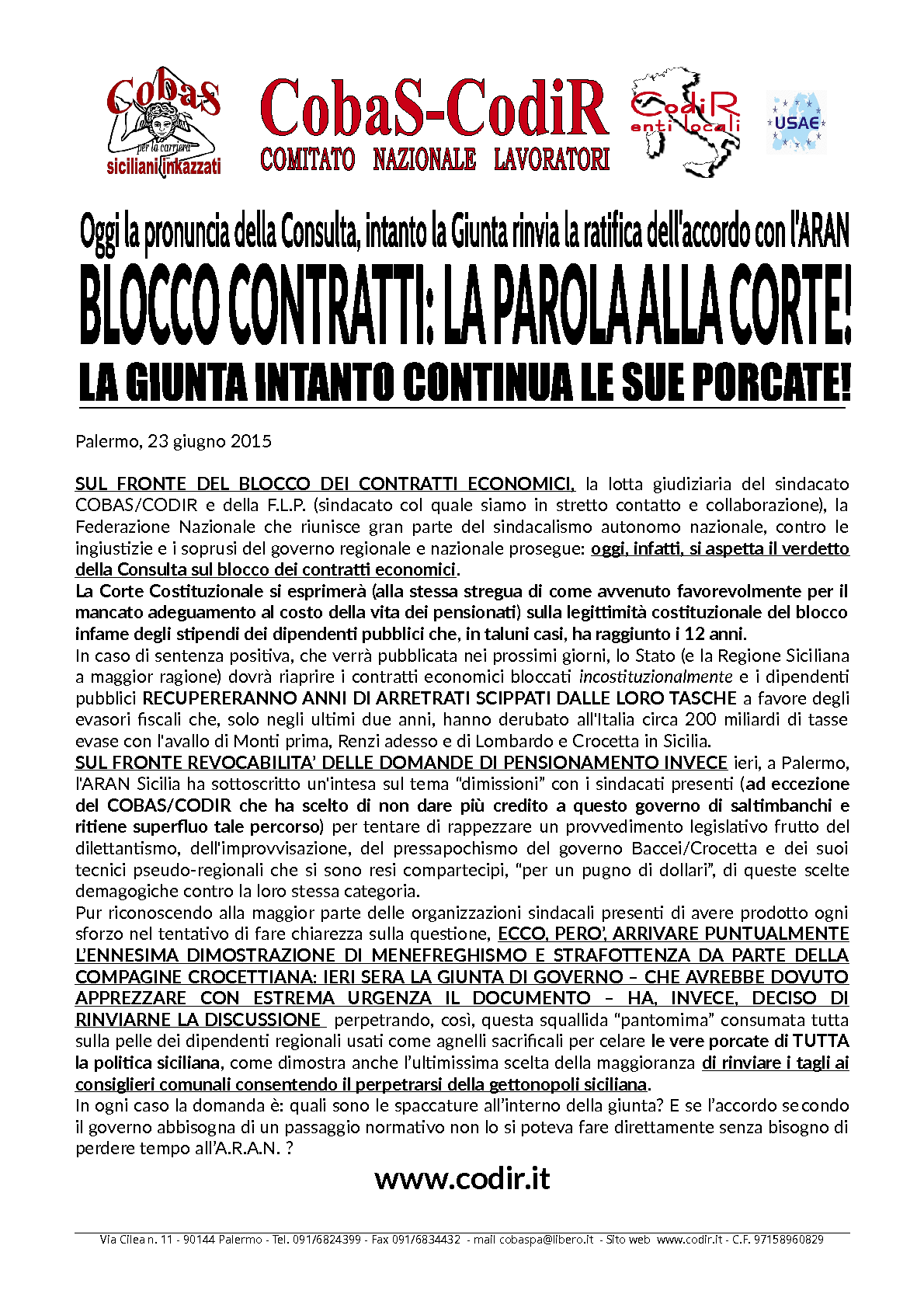 COBAS-CODIR Segreteria Generale -90144 Palermo, via Francesco Cilea n. 11 Tel. 091 6824399 – Fax 091 6834432 – email: segreteria.codir@gmail.com – Pec: segreteria.generale@pec.codir.it