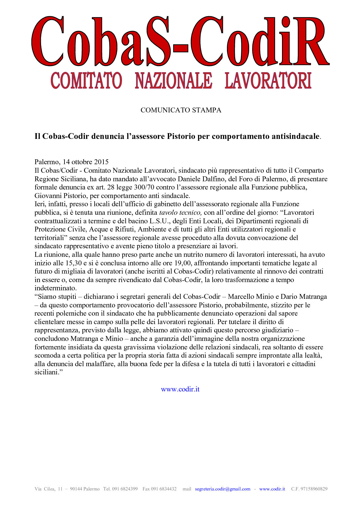 COBAS-CODIR Segreteria Generale -90144 Palermo, via Francesco Cilea n. 11 Tel. 091 6824399 – Fax 091 6834432 – email: segreteria.codir@gmail.com – Pec: segreteria.generale@pec.codir.it