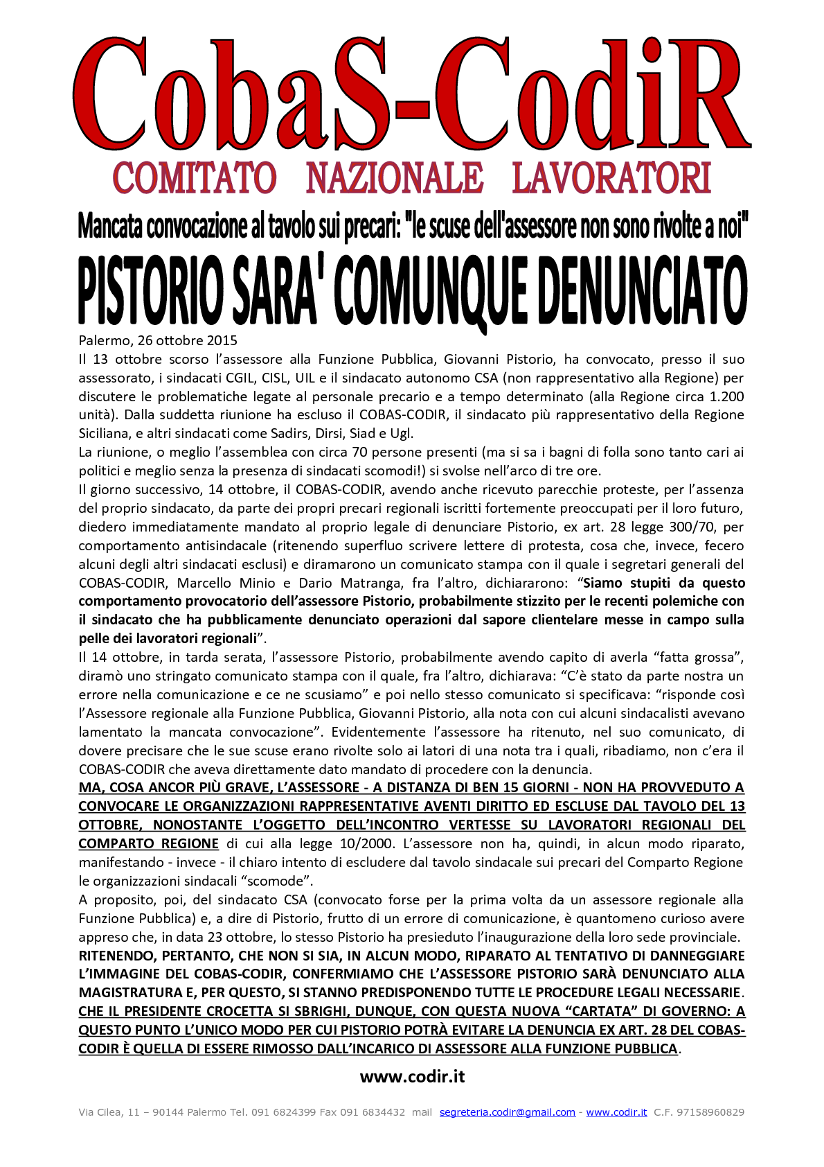 COBAS-CODIR Segreteria Generale -90144 Palermo, via Francesco Cilea n. 11 Tel. 091 6824399 – Fax 091 6834432 – email: segreteria.codir@gmail.com – Pec: segreteria.generale@pec.codir.it